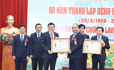 | Le Premier ministre Nguyên Xuân Phuc (1er plan, à droite) remet l’Ordre du Travail de première classe à l’hôpital Huu Nghi. |