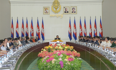 | Le Premier ministre cambodgien Hun Sen (centre) travaille avec la délégation du Comité central de l'Association d'amitié Vietnam-Cambodge, |