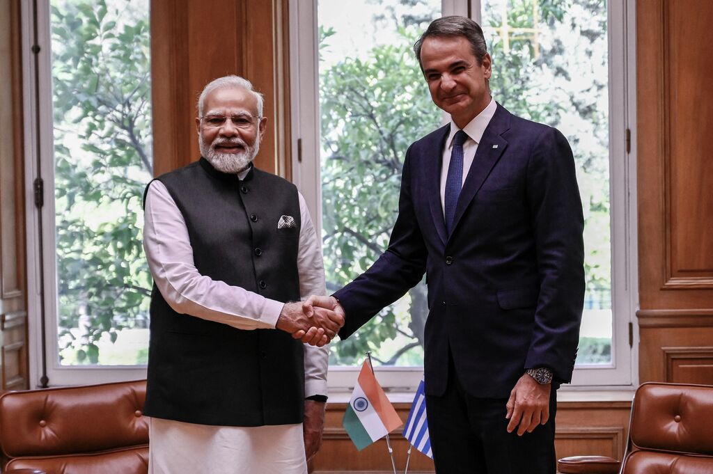 | Le Premier ministre indien Narendra Modi (gauche) et son homologue grec Kyriakos Mitsotakis, le 25 août à Athène. |