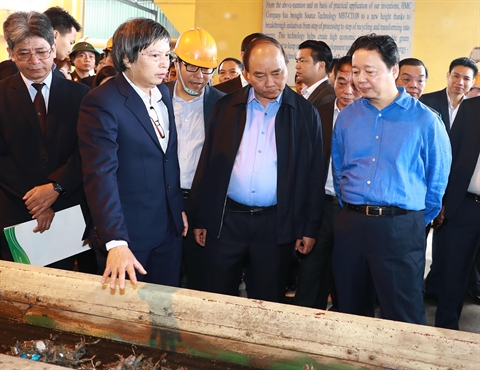| Le Premier ministre Nguyên Xuân Phuc (centre) examine le modèle appliquant la technologie vietnamienne de production d’électricité à partir de déchets, à Hà Nam le 18 mars. |