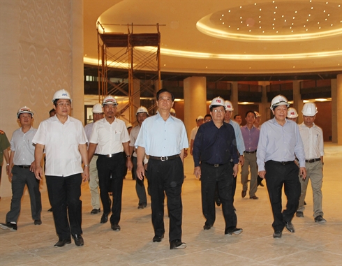 | Le Premier ministre Nguyên Tân Dung (centre, 1er plan) inspecte le chantier du bâtiment de l’AN, le 3 octobre à Hanoi. |