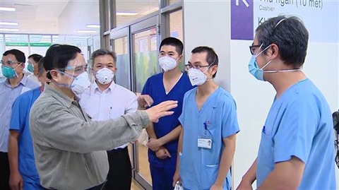 | Le Premier ministre Pham Minh Chinh (gauche) rend visite aux agents de santé dans un hôpital de Binh Duong, le 27 août. |