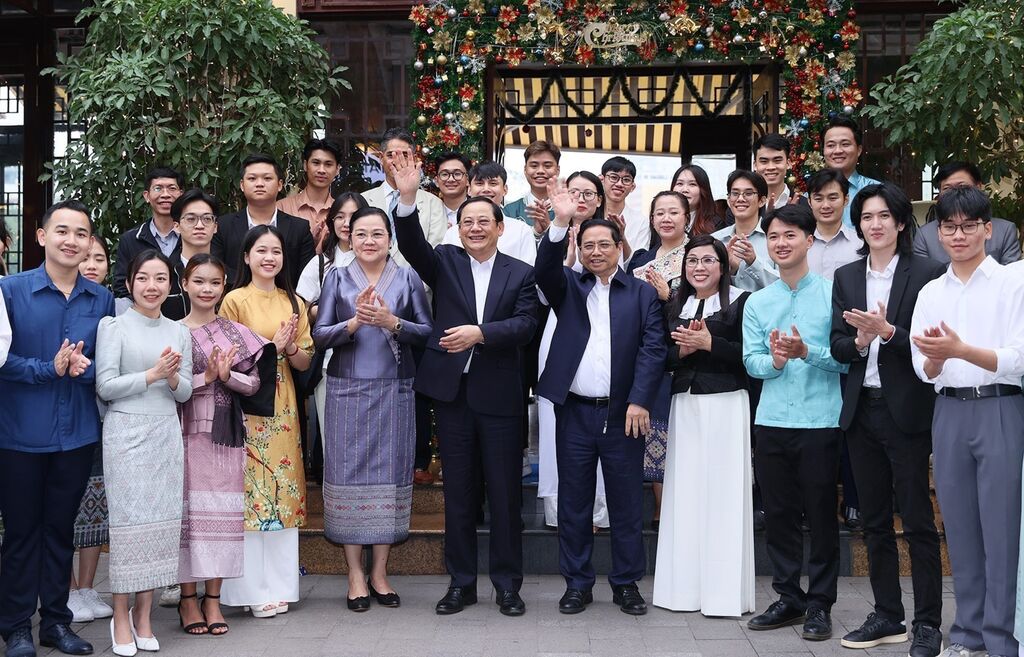 | Les Premiers ministres vietnamien Pham Minh Chinh et lao Sonexay Siphandone lors de leur rencontre avec des étudiants à Hanoï, le 7 janvier. |