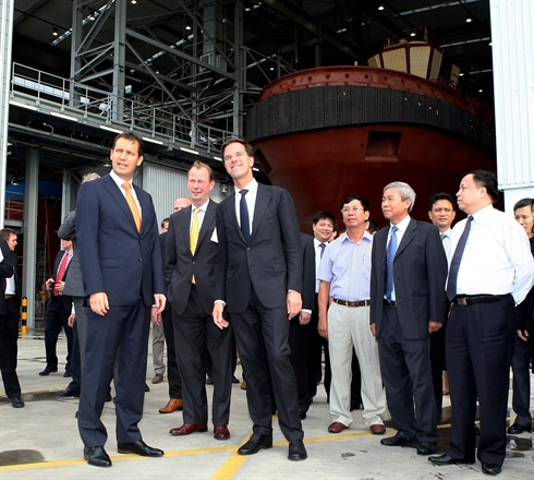 | Le Premier ministre néerlandais Mark Rutte (Centre) visite l'usine de construction navale Damen Song Gâm. |