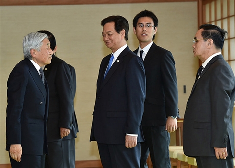 | L’empereur japonais Akihito (gauche) reçoit le Premier ministre Nguyên Tân Dung (centre). |