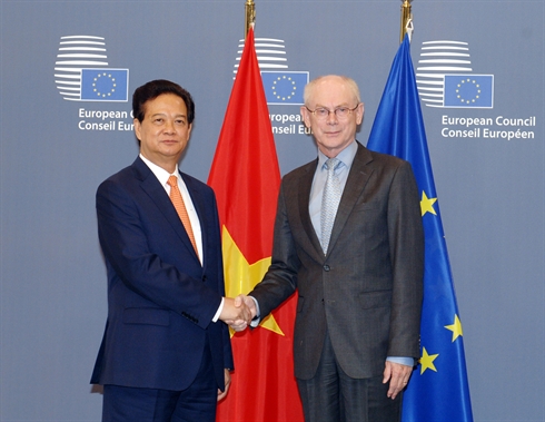 | Le Premier ministre vietnamien Nguyên Tân Dung (gauche) et le président du Conseil européen Herman Van Rompuy, le 13 octobre à Bruxelles. |