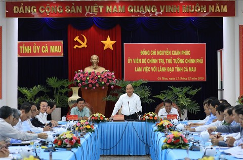 | Le Premier ministre Nguyên Xuân Phuc (débout) lors d'une séance de travail avec des dirigeants de la province de Cà Mau (delta du Mékong), le 11 décembre. |