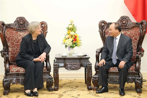 | Le Premier ministre Nguyên Xuân Phuc et la présidente de l'Université Harvard, Drew Gilpin Faust, le 24 mars à Hanoï. |