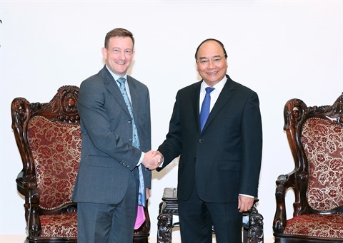 | Le Premier ministre Nguyên Xuân Phuc (droite) et le nouvel ambassadeur de France au Vietnam, Bertrand Lortholary, le 24 novembre à Hanoï |