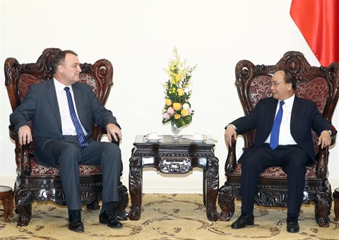 | Le Premier ministre vietnamien, Nguyên Xuân Phuc (à droite), et l'ambassadeur slovaque au Vietnam, Igor Pacolaki, le 11 septembre, à Hanoï. |