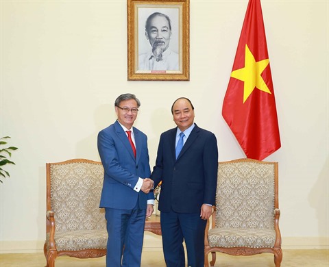 | Le Premier ministre Nguyên Xuân Phuc (droite) et l'ambassadeur laotien Thongsavanh Phomvihane, le 9 octobre à Hanoï. |