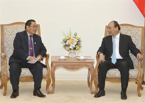 | Le vice-président de l’AN du Laos, Sengnouane Xayalat (gauche), reçu par le Premier ministre Nguyên Xuân Phuc, le 18 juillet à Hanoï. |