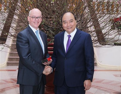 | Le Premier ministre Nguyên Xuân Phuc (droite) et le représentant en chef permanent du Fonds monétaire internationale au Vietnam, Jonathan Dunn, le 13 février à Hanoï. |