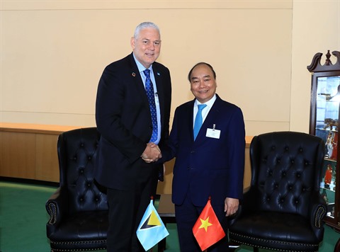 S'adressant au Premier ministre de Sainte-Lucie, Allen Chastanet, le Premier ministre Nguyên Xuân Phuc s'est félicité de l'établissement des relations diplomatiques entre les deux pays le 26 juin dernier. Pour le développement substantielle des relations entre les deux pays, le Premier ministre a suggéré que les deux parties augmentent les échanges de délégations à tous les niveaux, envisagent la mise en place d'un mécanisme de coopération bilatérale et créent des conditions favorables pour leurs entreprises d’explorer le marché et les opportunités commerciales, en particulier dans les domaines où les deux parties ont des atouts tels que l'agriculture et le tourisme.