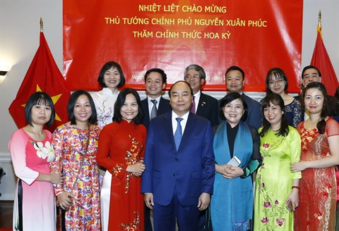 | Le Premier ministre Nguyên Xuân Phuc (1er plan, centre) et le personnel de l'ambassade du Vietnam aux États-Unis. |