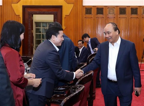 | Le Premier ministre Nguyên Xuân Phuc (droite) serre la main à un dirigeant de la province de Hà Tinh (Centre), le 4 mars à Hanoï. |