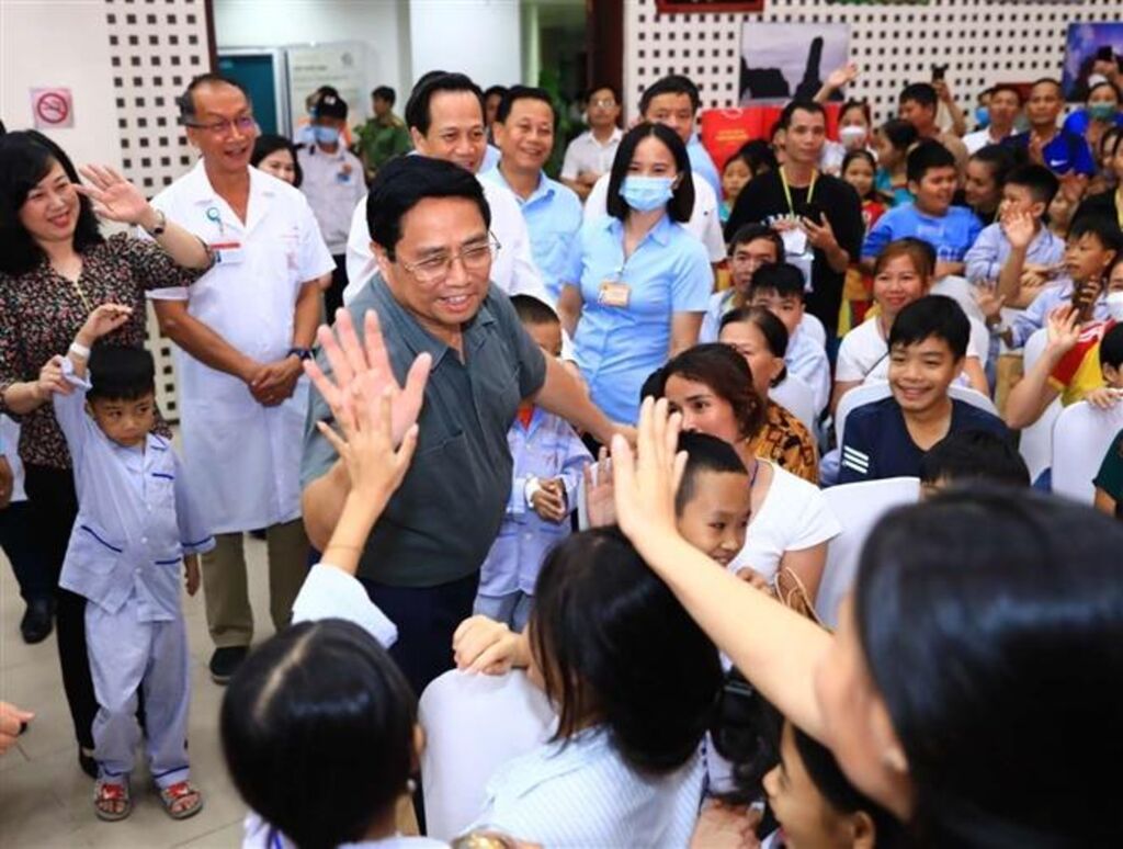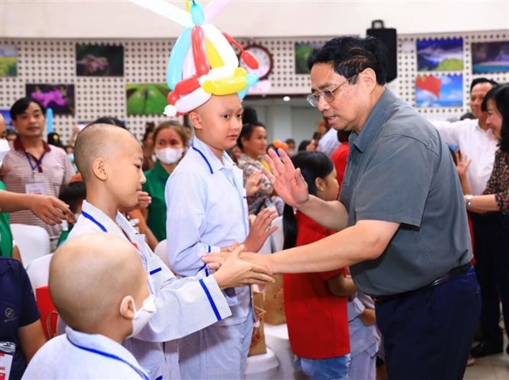 | Le Premier ministre Pham Minh rencontre des enfants patients soignés à l'Institut national d'hématologie et de transfusion sanguine. |