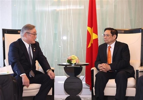 | Le Premier ministre Pham Minh Chinh (droite) et un dirigeant du groupe Sumitomo à Tokyo, le 24 novembre. |