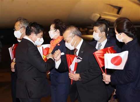 | Le Premier ministre Pham Minh Chinh (gauche) à sa descente d’avion à l’aéroport international de Haneda dans la capitale japonaise Tokyo, le 22 novembre. |
