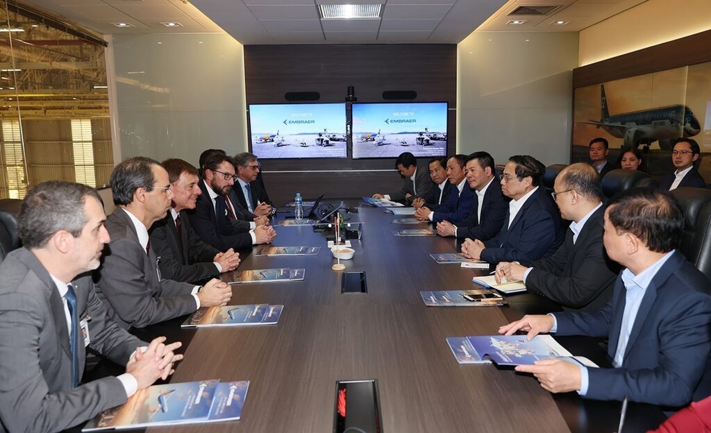 Après son arrivée à São Paulo, le Premier ministre Pham Minh Chinh a visité le l’avionneur brésilien Embraer - le 3e constructeur aéronautique mondial après Boeing et Airbus, qui opère dans 80 pays avec ses plus de 18.000 employés et un chiffre d’affaires de 4,6 milliards d'USD en 2022. Au Vietnam, le groupe a livré à Bamboo Airways cinq Embraer 190 (E90).