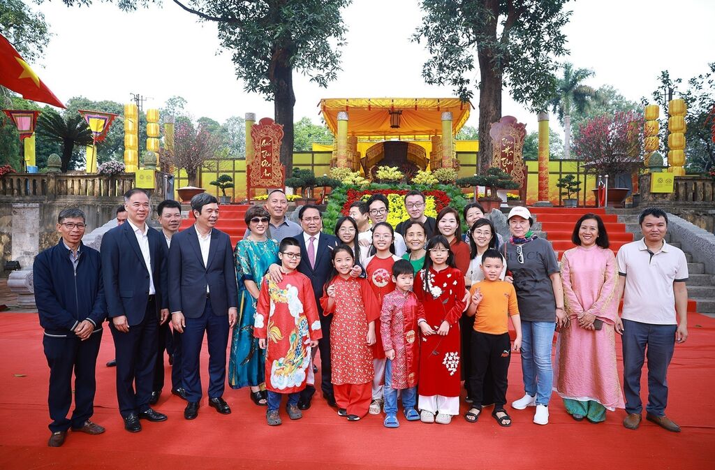 | Le Premier ministre Pham Minh Chinh (2e rang, 5e à gauche) aux côtés de touristes sur le site historique de la Cité impériale de Thăng Long, à Hanoï. |