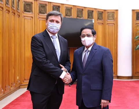 | Le Premier ministre Pham Minh Chinh (droite) et l'ambassadeur de Pologne au Vietnam, Wojciech Gerwel, le 17 août à Hanoï. |