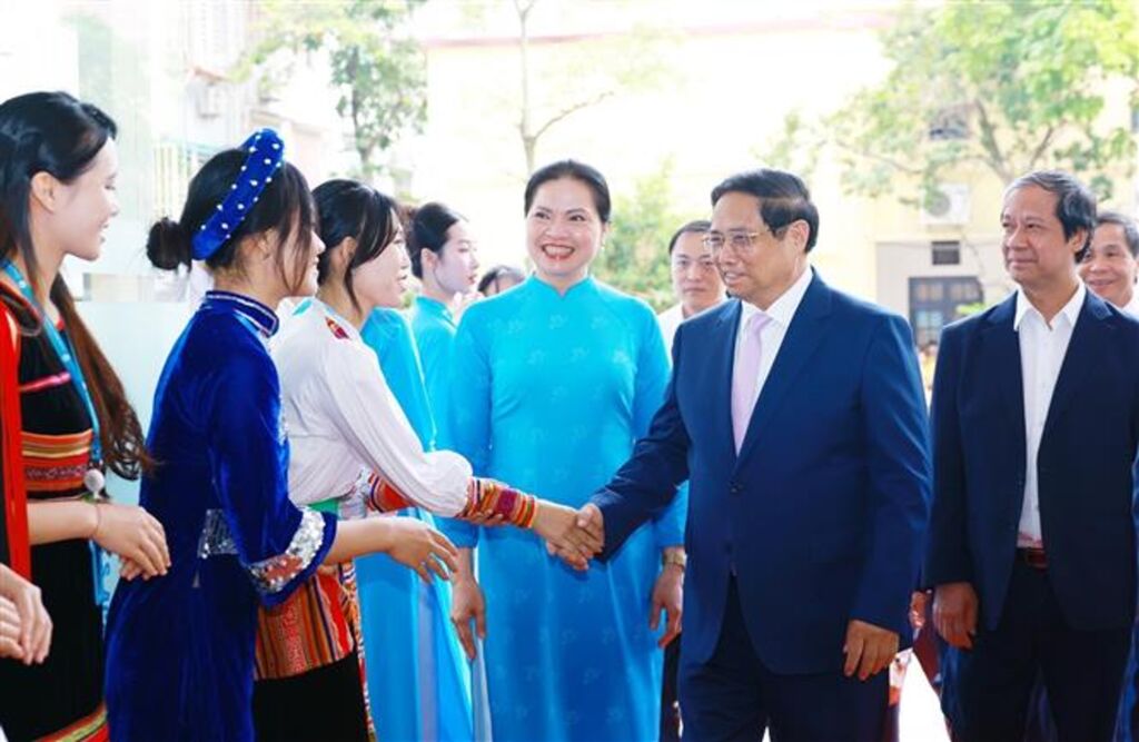 | Le Premier ministre Pham Minh Chinh (centre) entouré d'étudiantes et d'enseignants de l'Académie des femmes du Vietnam, le 17 octobre à Hanoï. |