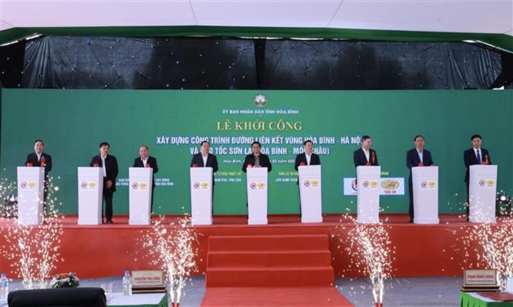 | Le Premier ministre Pham Minh Chinh (centre) lors de la cérémonie de lancement des travaux routiers reliant Hòa Binh, Hanoï et la province de Son La, le 26 février. |