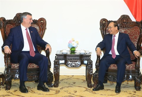 | Le Premier ministre vietnamien Nguyên Xuân Phuc (droite) et le président-directeur général de la Société américaine Boeing, Kevin Mc Allister, le 2 octobre à Hanoï. |