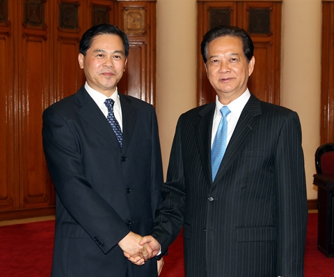 | Le Premier ministre Nguyên Tân Dung (droite) et le gouverneur de la province chinoise du Yunnan, Cheng Hao, le 11 mai à Hanoi. |