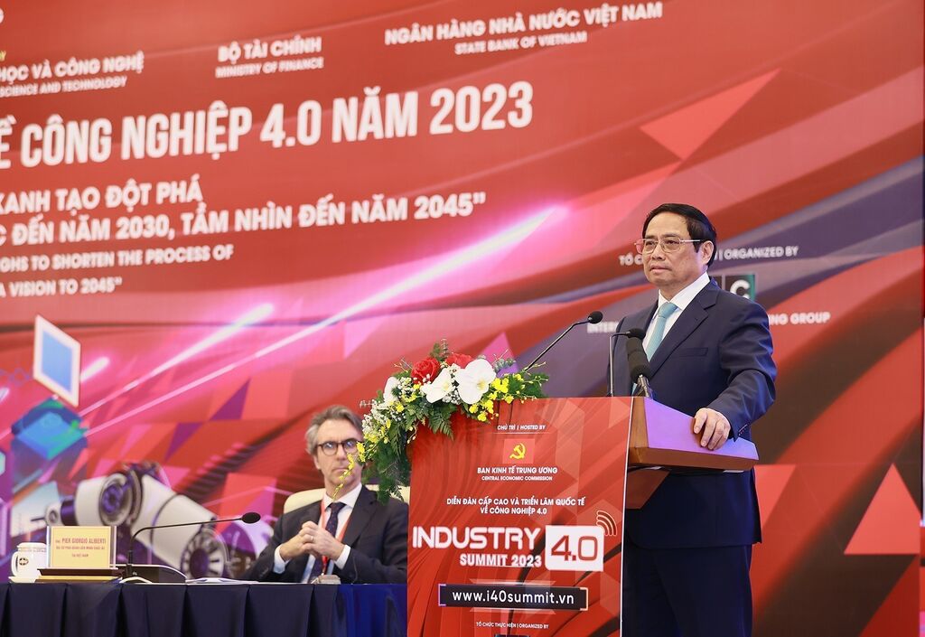 | Le Premier ministre Pham Minh Chinh s'exprime lors du forum annuel de la 4e révolution industrielle, le 14 juin à Hanoï. |