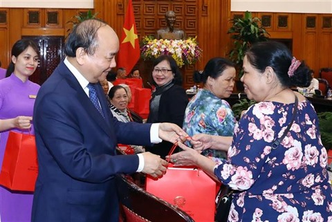 | Le Premier ministre Nguyên Xuân Phuc offre des cadeaux aux personnes méritantes de l’arrondissement de Hai Châu, Dà Nang, le 6 mars à Hanoï. |