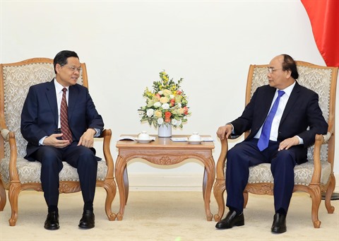 | Le Premier ministre Nguyên Xuân Phuc (droite) reçoit le président de la région autonome Zhuang du Guangxi, Chen Wu, le 20 avril à Hanoï. |