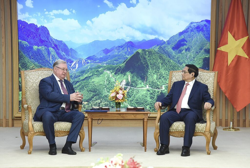 | Le Premier ministre Pham Minh Chinh (droite) et le président de la RFBA, Sergey Stepashin, le 23 avril à Hanoï.  |