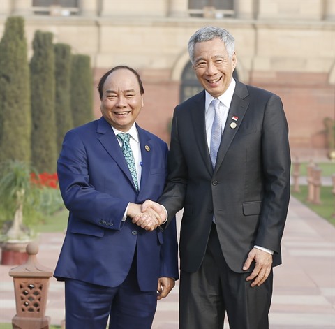| Le Premier ministre Nguyên Xuân Phuc (gauche) et son homologue singapourien Lee Hsien Loong. |