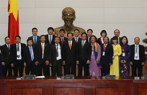 | Le Premier ministre Nguyên Tân Dung (1er plan, centre) et des entrepreneurs exemplaires, le 13 décembre à Hanoi. |
