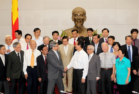 | Le Premier ministre Nguyên Tân Dung (4e, 1er plan), lors d'une rencontre le 26 mai à Hanoi avec des représentants du milieu des intellectuels du secteur des sciences et des technologies. |