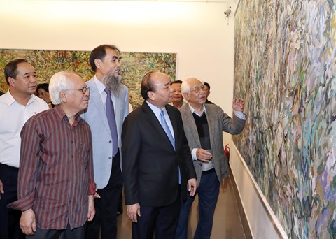 | Le Premier ministre Nguyên Xuân Phuc (cravate bleue) regarde un tableau au Musée des beaux-arts du Vietnam, le 28 octobre. |