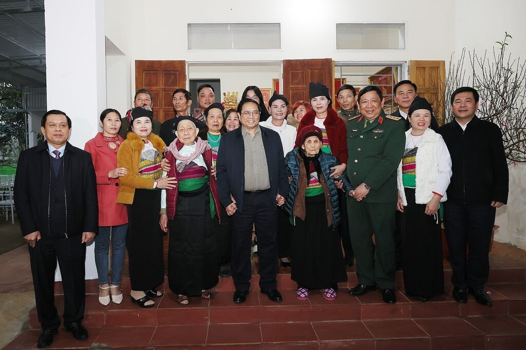 | Le Premier ministre (centre) rend visite à la famille de la Mère Héroïne vietnamienne Bùi Thi Nhi, 104 ans, d'ethnie Muong, district de Ngoc Lac, province de Thanh Hoa. |