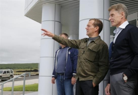 | Le Premier ministre russe, Dmitri Medvedev (centre), et le gouverneur de la région de Sakhaline, Oleg Kozhemyako (droite), le 22 août 2015, lors de la visite de l'île Iturup, l'une des quatre îles russes des Kouriles du Sud. |