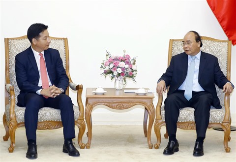 | Le Premier ministre Nguyên Xuân Phuc (droite) et le directeur exécutif du groupe AEON et du directeur général du centre commercial AEON MALL Vietnam, Y. Iwamura, le 20 juin à Hanoï. |