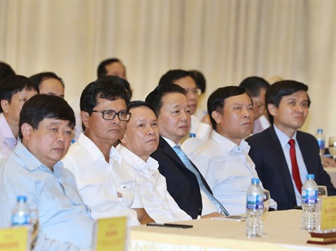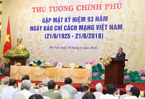 | Le Premier ministre Nguyên Xuân Phuc (debout) adresse aux journalistes vétérans et aux dirigeants des organes de presse, lors de la rencontre du 20 juin. |