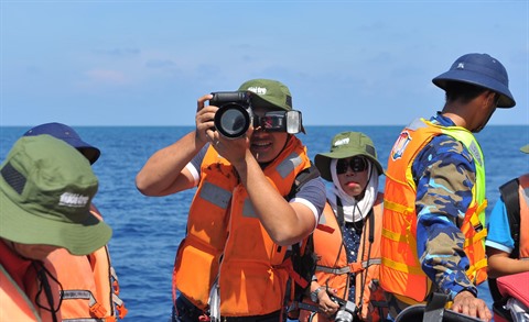 | Le reporter-photographe Pham Kiên, de l'Agence Vietnamienne d'Information, lors d'une mission sur l'archipel de Truong Sa (Spratly). |