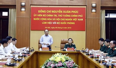 | Le Premier ministre Nguyên Xuân Phuc s’exprime lors la séance de travail avec le ministère de la Défense, le 8 août à Hanoï. |