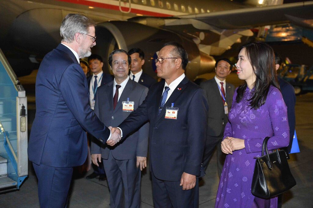 | Le Premier ministre tchèque Petr Fiala (gauche) à l'aéroport international de Nôi Bài, à Hanoï, le soir du 20 avril. |