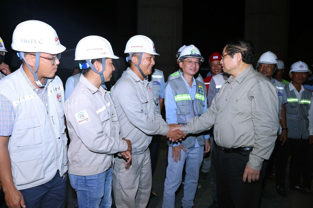 | Le Premier ministre rencontre des ouvriers sur les chantiers du pont de Rach Miêu 2. |