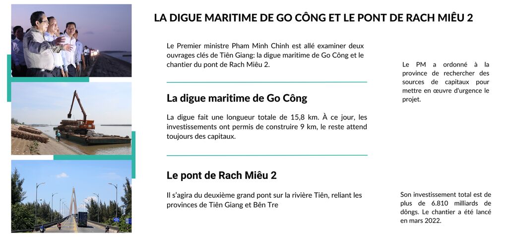 Soulignant le rôle important de cette digue, le Premier ministre a ordonné aux ministères, départements concernés et à la province de Tiên Giang de rechercher des sources de capitaux pour mettre en œuvre d'urgence le projet.