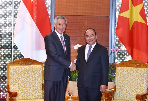 | Le Premier ministre Nguyên Xuân Phuc (droite) et l'homologue singapourien Lee Hsien Loong lors de WEF ASEAN 2018 à Hanoï. |