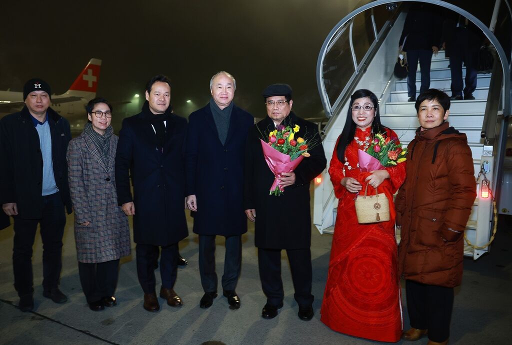 | Le Premier ministre Pham Minh Chinh (droite) et son épouse sont accueillis par le personnel de l'ambassade du Vietnam en Suisse, dans la nuit du 20 janvier (heure locale) à l'aéroport de Zurich. |