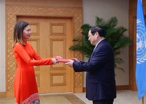| La coordonnatrice résidente des Nations unies Pauline Tamesis présente la lettre de créances du secrétaire général des Nations unies au Premier ministre Pham Minh Chinh, le 13 juillet à Hanoï. |